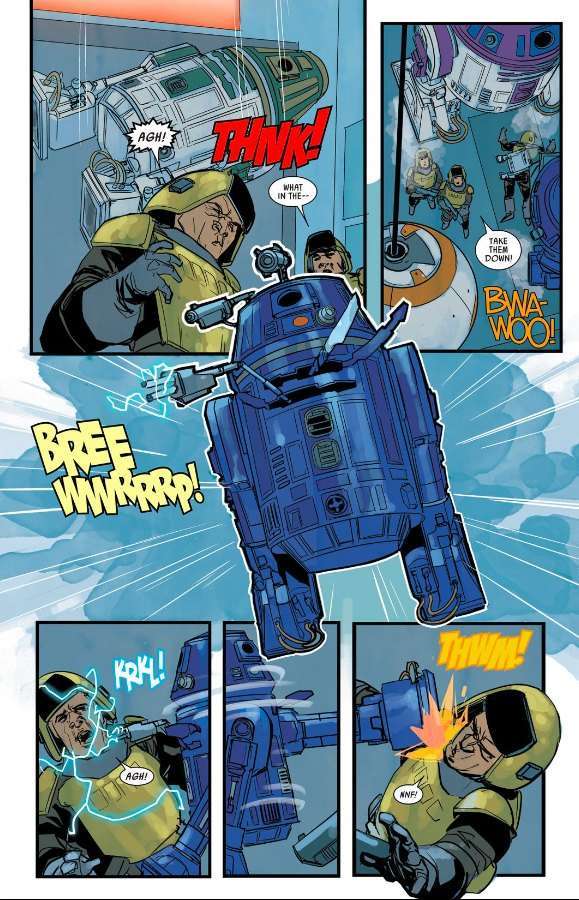 Poe Dameron mette in moto gli eventi dei prossimi numeri, con un numero in parallelo tra tre storyline: Terex espone le sue macchinazioni elaborate contro Grakkus agli altri signori del crimine – e iniziamo a scoprire che è qualcosa di più di un semplice ufficiale del Primo Ordine, Poe Dameron e la Squadriglia Nera cercano di sopravvivere all’assalto dei criminali, BB-8 e gli altri droidi si apprestano a salvare Poe. Il numero non è niente di memorabile, ma conferma l’ottima qualità della scrittura di Soule e del tratto di Noto.