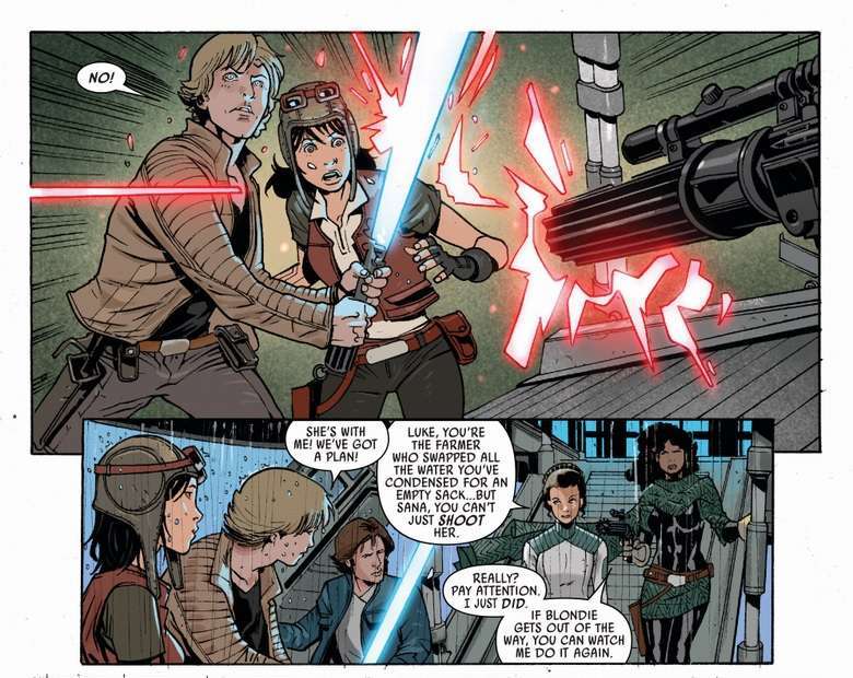 Un numero ricco d’azione ma che presenta, allo stesso tempo, un piccolo ma interessante approfondimento sulla vita e il carattere sia di Luke che di Aphra. L’ottimismo di Luke, la sua solarità, anche il suo aspetto: tutto indica che Luke debba aver avuto una vita facile. Aphra si dimostra più cinica, ma non sa che in realtà è proprio il carattere del giovane. Interessante anche il discorso sulla “bontà” dell’Impero, che mantiene tutto sommato la pace nella Galassia. Belli i disegni: apprezzo molto il tratto di Andrea (Broccardo) e lo preferisco nettamente rispetto all’eccessivo fotorealismo di Larroca, che firma il capitolo precedente e successivo sulla testata “Star Wars”, grazie a questo disegno fresco, pulito e sì, sicuramente più “fumettoso”.