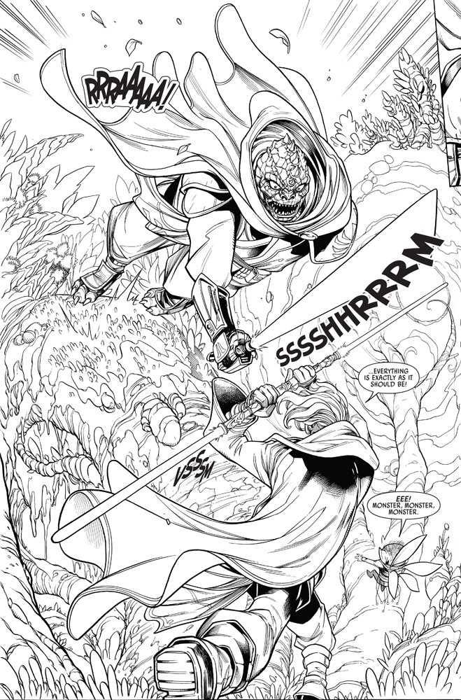 Dopotutto, parte del divertimento nel lavorare su Star Wars oggi è basarsi sui contenuti decennali già esistenti e confrontarsi con altri artisti che sono stati influenzati dalla saga. “Contribuire a creare parte della mitologia di Star Wars è un sogno per noi alla Marvel”, dice l’editor Mark Paniccia. Ad esempio, la piccola creatura alata che Keeve incontra su Shuraden è uno Ximpi, una razza creata da un altro degli architetti dell’Alta Repubblica – Charles Soule – per il suo fumetto Lando del 2016. “