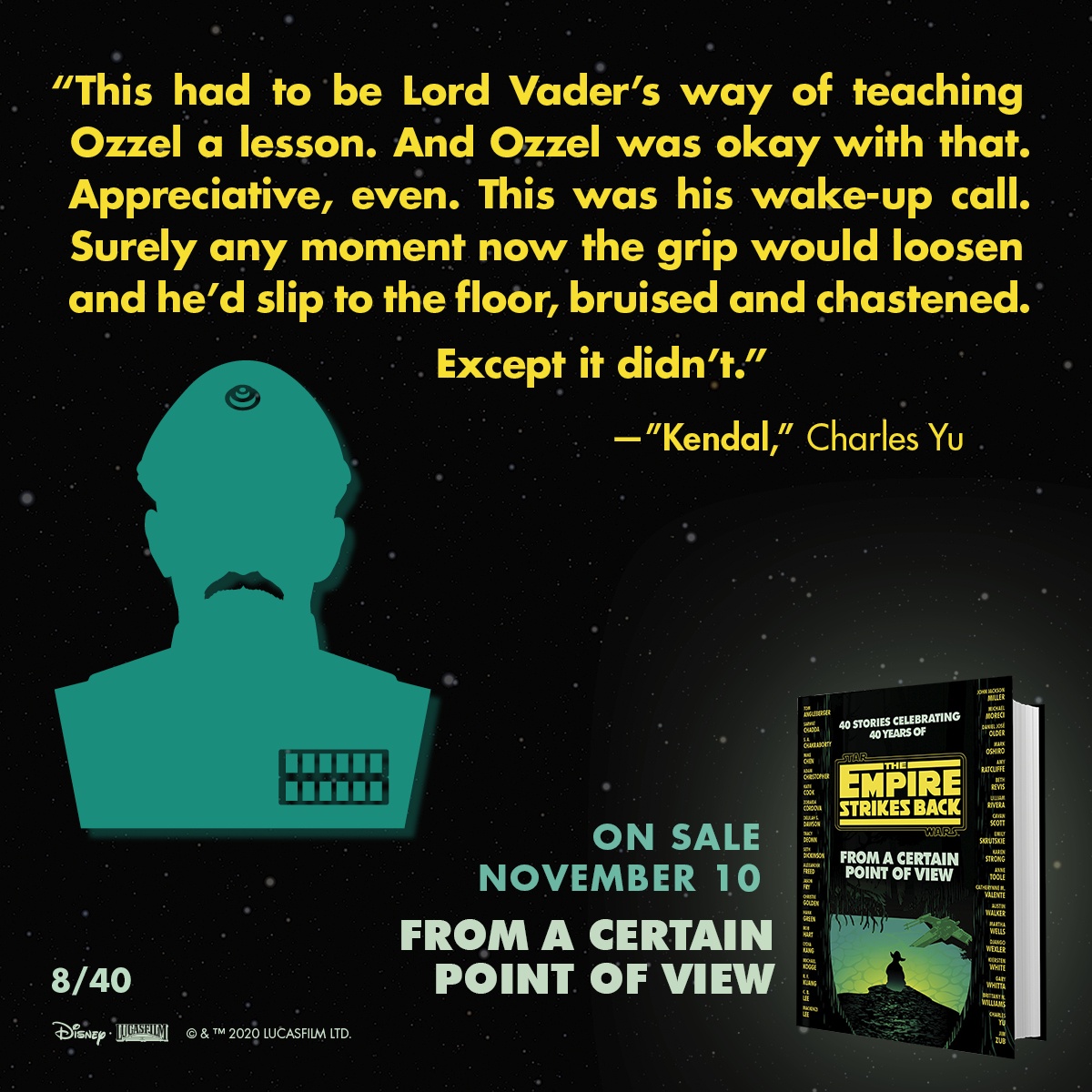 Come già annunciato lo scorso 12 giugno, dal 10 novembre prossimo sarà disponibile nelle librerie di oltreoceano l’attesissimo From a Certain Point of View – The Empire Strikes Back, sequel di From a Certain Point of View edito da Del Rey e nato con l’intento di celebrare il quarantennale dell’uscita nelle sale cinematografiche di Episodio V – L’Impero Colpisce Ancora.