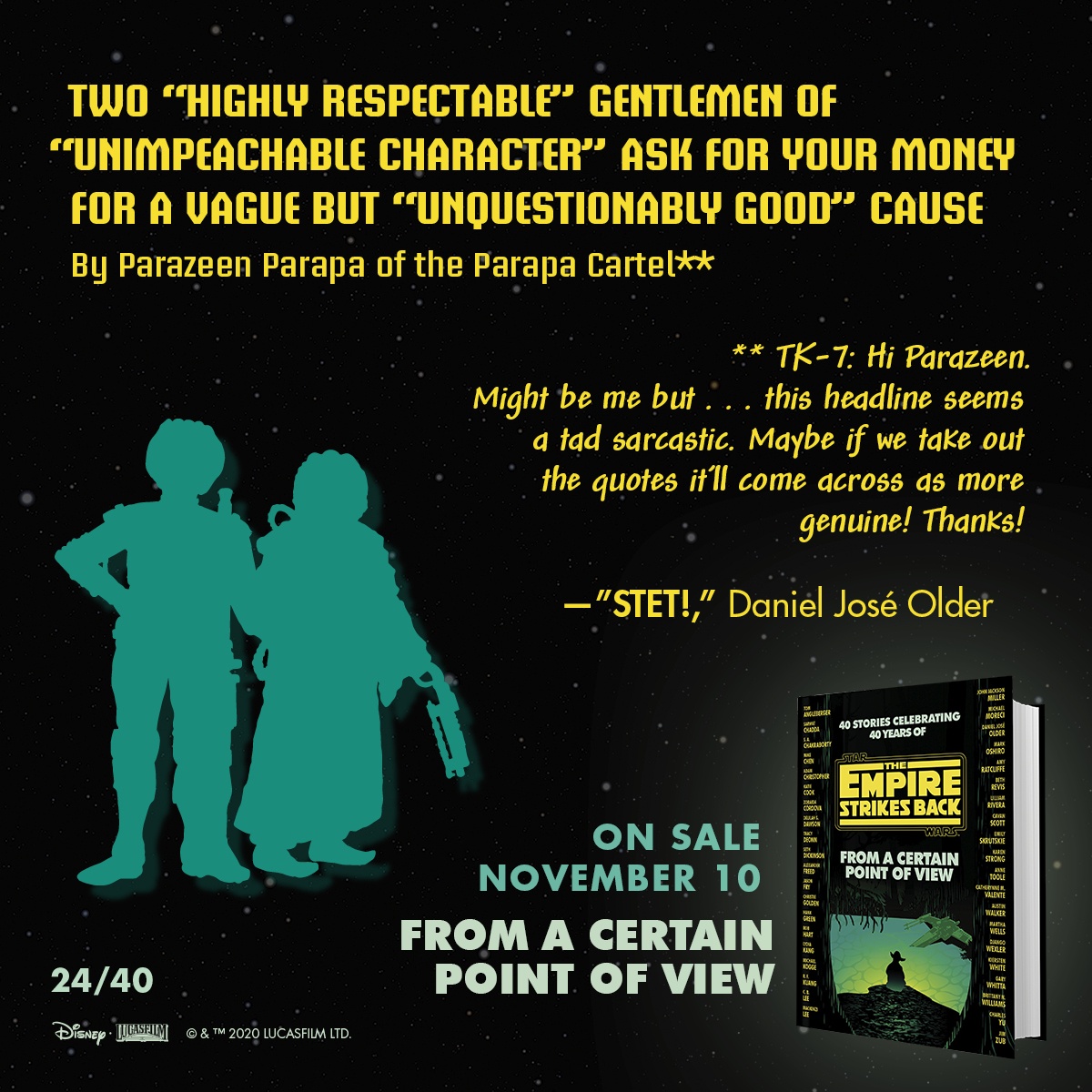 Come già annunciato lo scorso 12 giugno, dal 10 novembre prossimo sarà disponibile nelle librerie di oltreoceano l’attesissimo From a Certain Point of View – The Empire Strikes Back, sequel di From a Certain Point of View edito da Del Rey e nato con l’intento di celebrare il quarantennale dell’uscita nelle sale cinematografiche di Episodio V – L’Impero Colpisce Ancora.