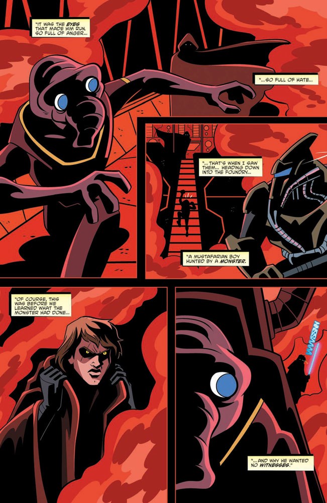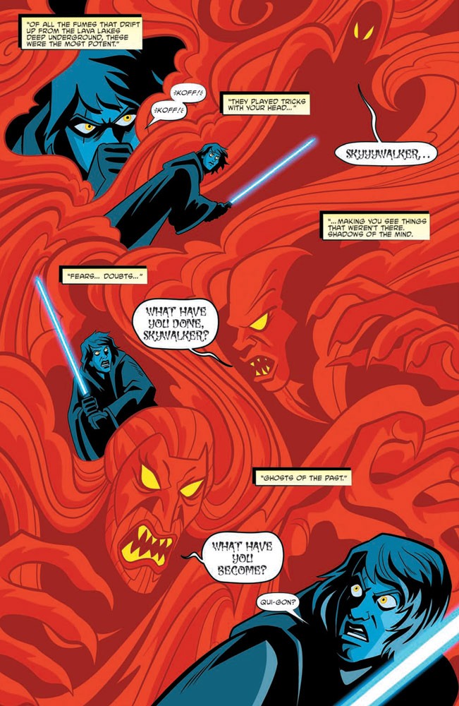 Mentre un giovane Mustafariano Settentrionale fugge dal neoproclamato Signore dei Sith, il Meridionale Lellis libera dei getti di vapore incandescente che generano delle visioni dei Maestri Jedi da lui traditi, probabilmente dovute al fatto che Mustafar sia un nexus per il Lato Oscuro, rallentando così l’avanzata Anakin.