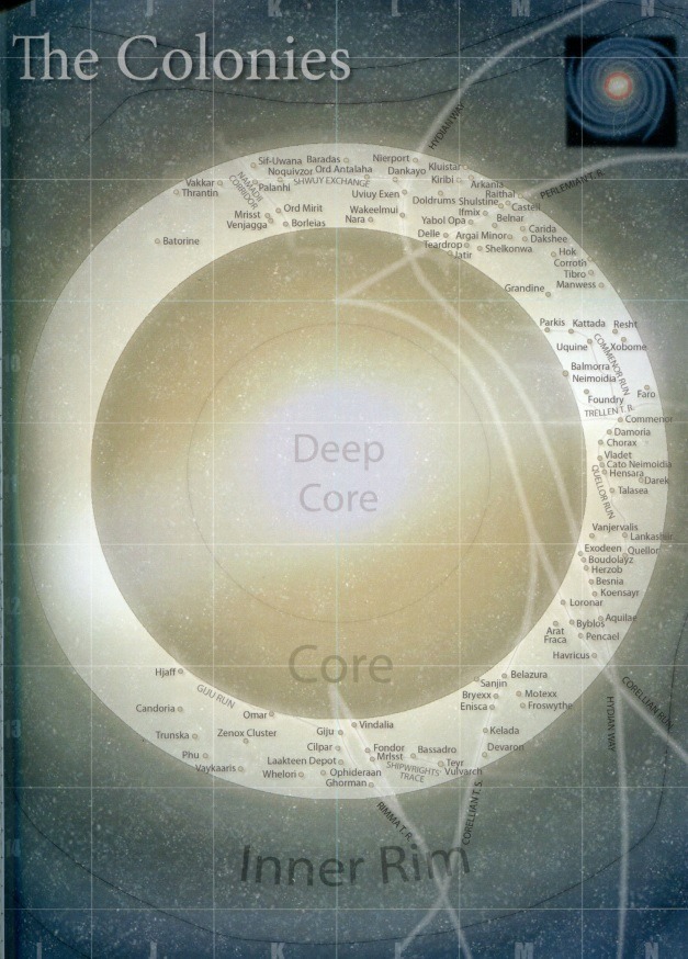 Tra i primi mondi ad essere colonizzati ancor prima della formazione della Repubblica, le Colonie vengono considerate il motore economico e produttivo della Galassia: centri urbani, industriali e commerciali, terreno d’incontro tra le ricchezze del Nucleo e le materie prime dagli Orli.