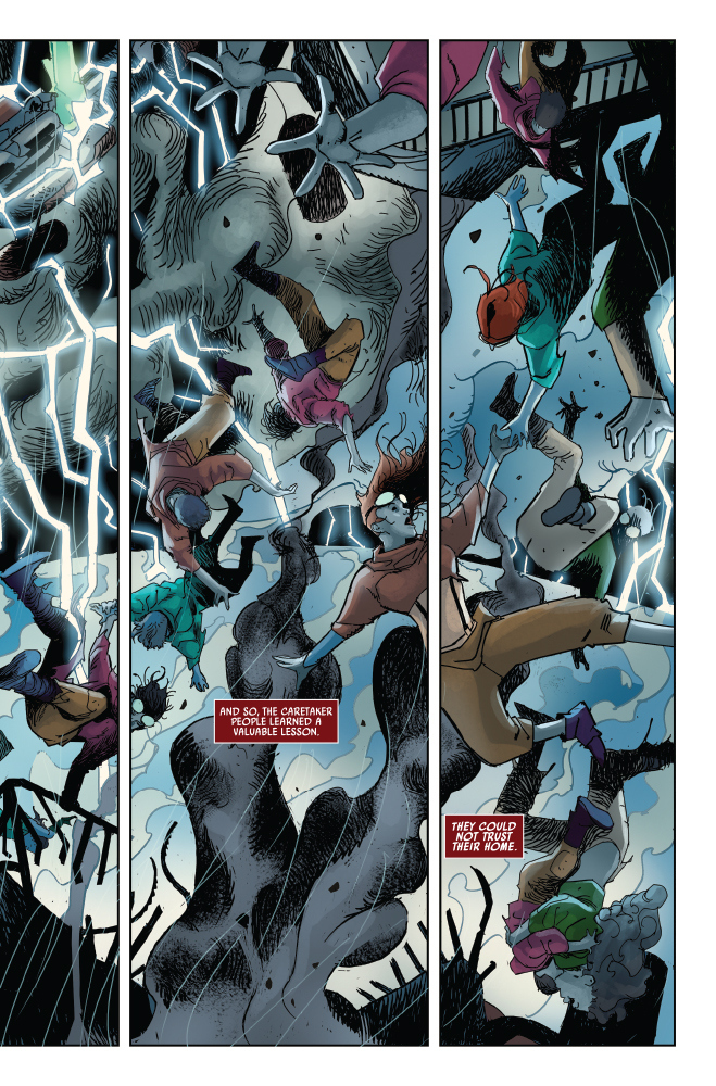 Parte dunque un ricordo o un flashback in cui ci viene mostrato Everon, il pianeta natale degli Evereni, il suo popolo. Essendo il pianeta a base di mercurio essi vivono in case e fattorie su piattaforme sospese. Il tutto è costantemente avvolto nella tempesta. Un’atmosfera letteralmente elettrizzante resa ottimamente dai colori e dai blu freddi ed elettrici. Gli Evereni non hanno mai provato ad imbrigliare le forze naturali del pianeta ma piuttosto hanno imparato a convivere con esso e a prendersi cura di esso. Purtroppo, la tempesta non si prende cura di nessuno.