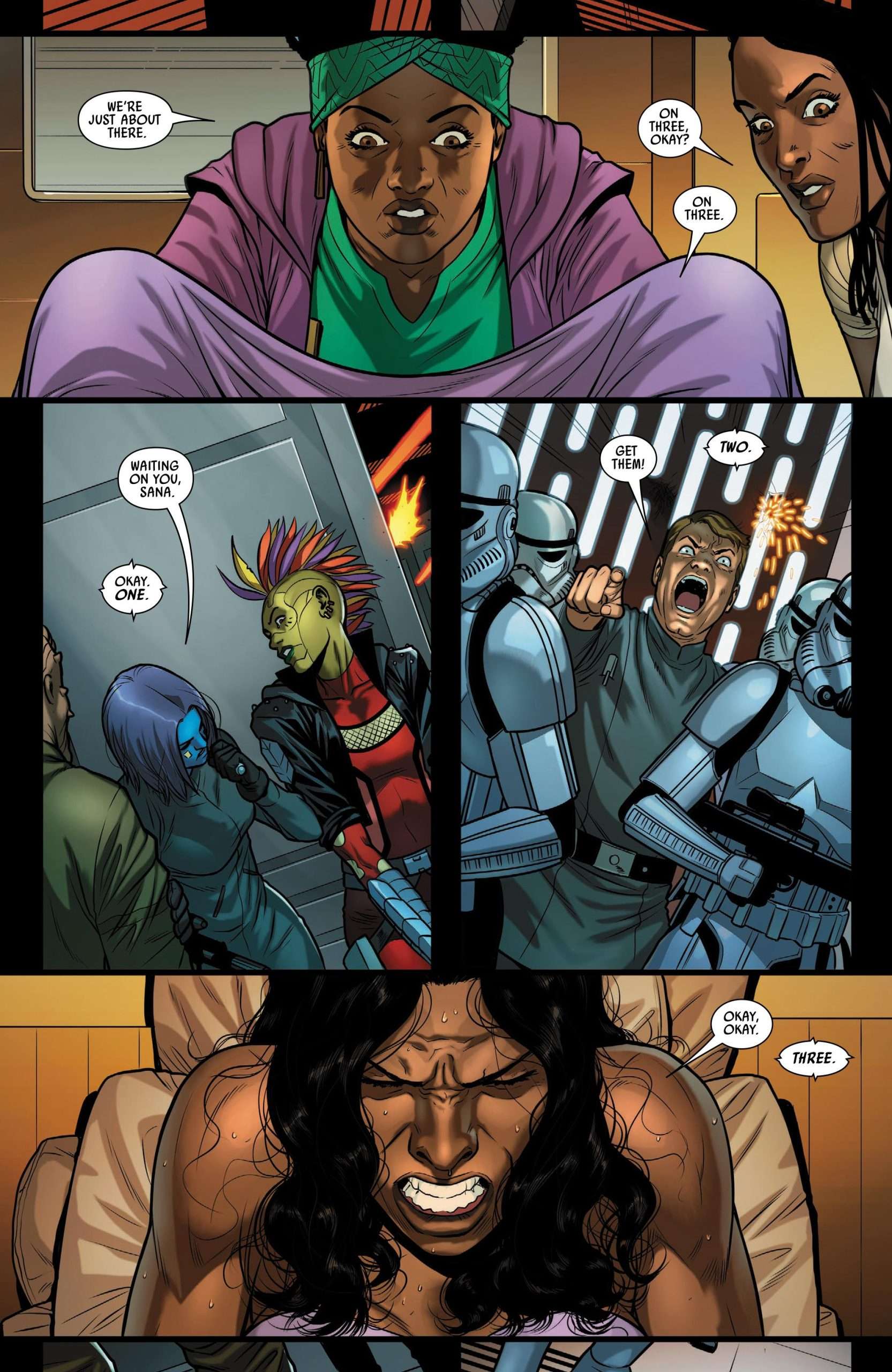 Nella seconda scena vediamo Aryssha durante il parto dei gemelli mentre è ancora sullo Star Destroyer imperiale. Il parto è ritmato a tempo di combattimento che si svolge fuori le sue porte.