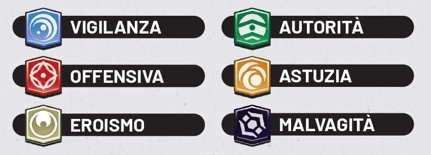 La principale distinzione è tra eroi e malvagi, ai quali si aggiungono altri quattro aspetti: vigilanza, offensiva, autorità e astuzia, ciascuno di questi si caratterizza per un simbolo, un colore e una tipologia di effetti generali che sono correlati all’identità di tali aspetti.