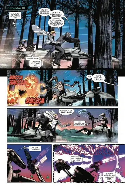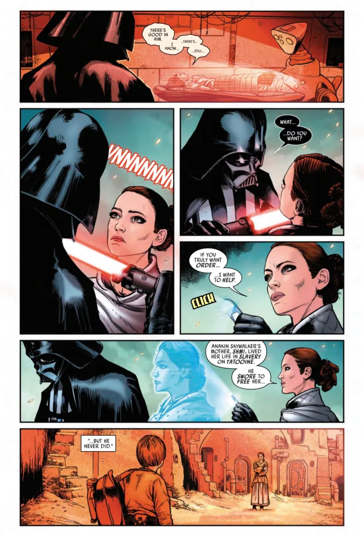 In ultimo abbiamo un nuovo piccolo gruppo di personaggi provenienti dal passato più recondito di Anakin Skywalker, i cui nomi non spoileriamo in questa sede. Viene da chiedersi, tuttavia, quale fosse il bisogno di introdurli per poi non usarli pressoché mai in modo proattivo o riprenderne veramente il rapporto con il personaggio principale. L’unico impiego è fare un richiamo emotivo di superficie che è funzionale al messaggio confuso della serie, ovvero, più o meno, che Darth Vader non è poi “così” cattivo. Si tratta di una tendenza per nulla convincente e a questo punto concludiamo che è un tratto irreversibile di questa serie a fumetti. Non è certo il modo di realizzare un protagonista tormentato, soprattutto dove abbiamo lavori ben migliori da questo punto di vista (eccone uno).