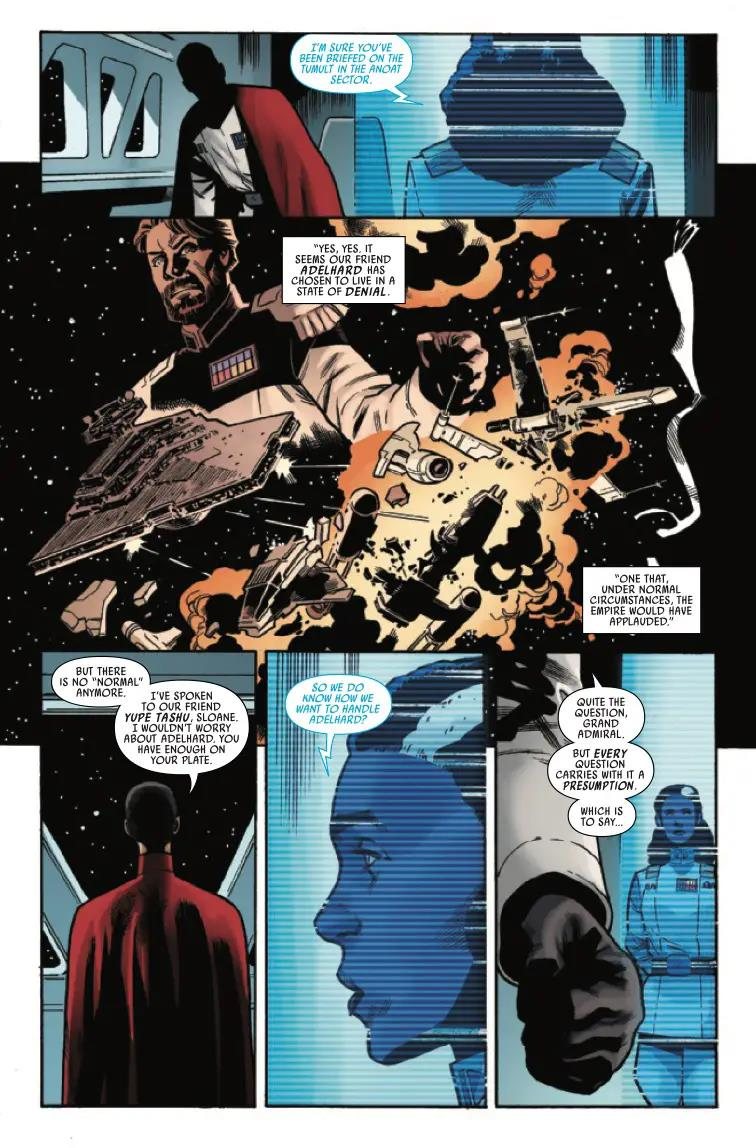 La nuova maxi-serie (della quale vi avevamo già parlato QUI) sarà composta da 3 archi narrativi, ognuno di 4 albi. Saranno numerosi i collegamenti con le altre opere del post-Endor: dopo il Gran Moff Adelhard e il Comandante Bragh (Star Wars: L’Insurrezione) è la volta dei Messaggeri dell’Imperatore (L’Impero a Pezzi e Battlefront II), Rae Sloane e Gallius Rax (Trilogia di Aftermath). I fan del Lato Cartaceo non possono che gioire per questa notizia, si tratta, infatti, della prima illustrazione ufficiale di Gallius Rax, personaggio, come la stessa Sloane, fondamentale per le opere ambientate in questo periodo storico della Galassia.