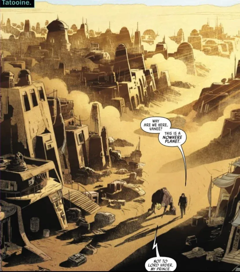 Inoltre, abbiamo un’interessante rivelazione da alcune tavole in anteprima del secondo albo: non solo Kylo Ren visiterà Tatooine accompagnato da Vaneé – più macchina, ora, che uomo – ma questi gli rivelerà anche dell’omicidio di Watto, perpetrato proprio da Darth Vader. Si tratta della prima volta in cui questo evento viene narrato in media canonici.