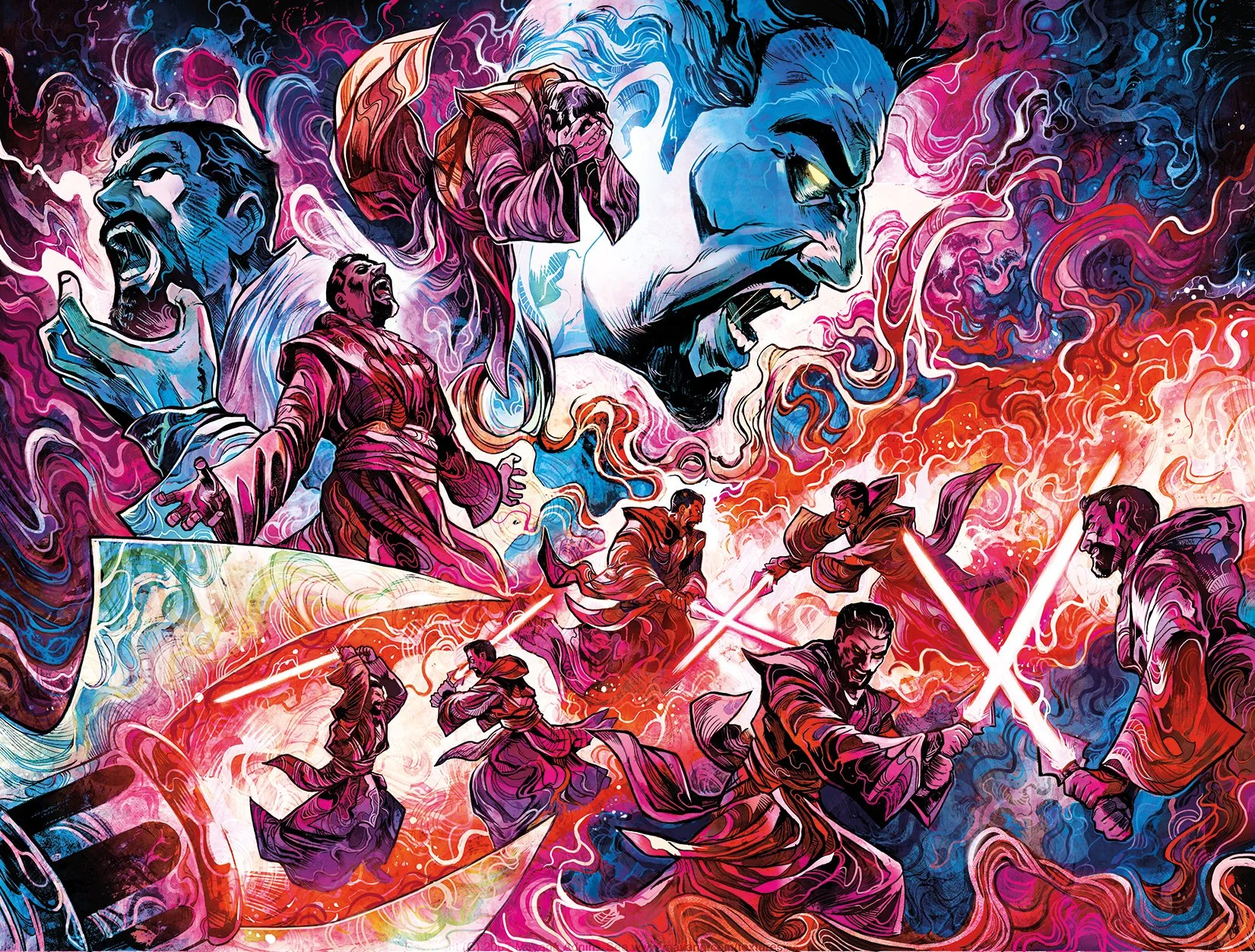 In linea con la struttura narrativa di cui sopra, quando i primi tre numeri della miniserie mostrano i flashback o gli holocron, all’ottimo Vincenzo Federici – che fornisce una prova con un buon grado di stilizzazione, un tratto fresco e un po’ spigoloso che ho trovato molto adatto alla storia – subentrano ulteriori disegnatori. Senza voler nulla togliere a Juan Samu e Giorgia Sposito, è sicuramente Vincenzo Riccardi a svettare tra queste pagine: a lui è affidata la leggenda oscura di Darth Ravi, che viene raffigurata col suo iconico e riconoscibile stile, portando all’estremo dalla narrazione quasi onirica. Linee sporche e spesse che si torcono, si uniscono e si separano, colori che esplodono dalle pagine, spade laser che si mescolano ai poteri del Lato Oscuro… Riccardi ha sicuramente alzato l’asticella dell’arte in Star Wars con questo albo.