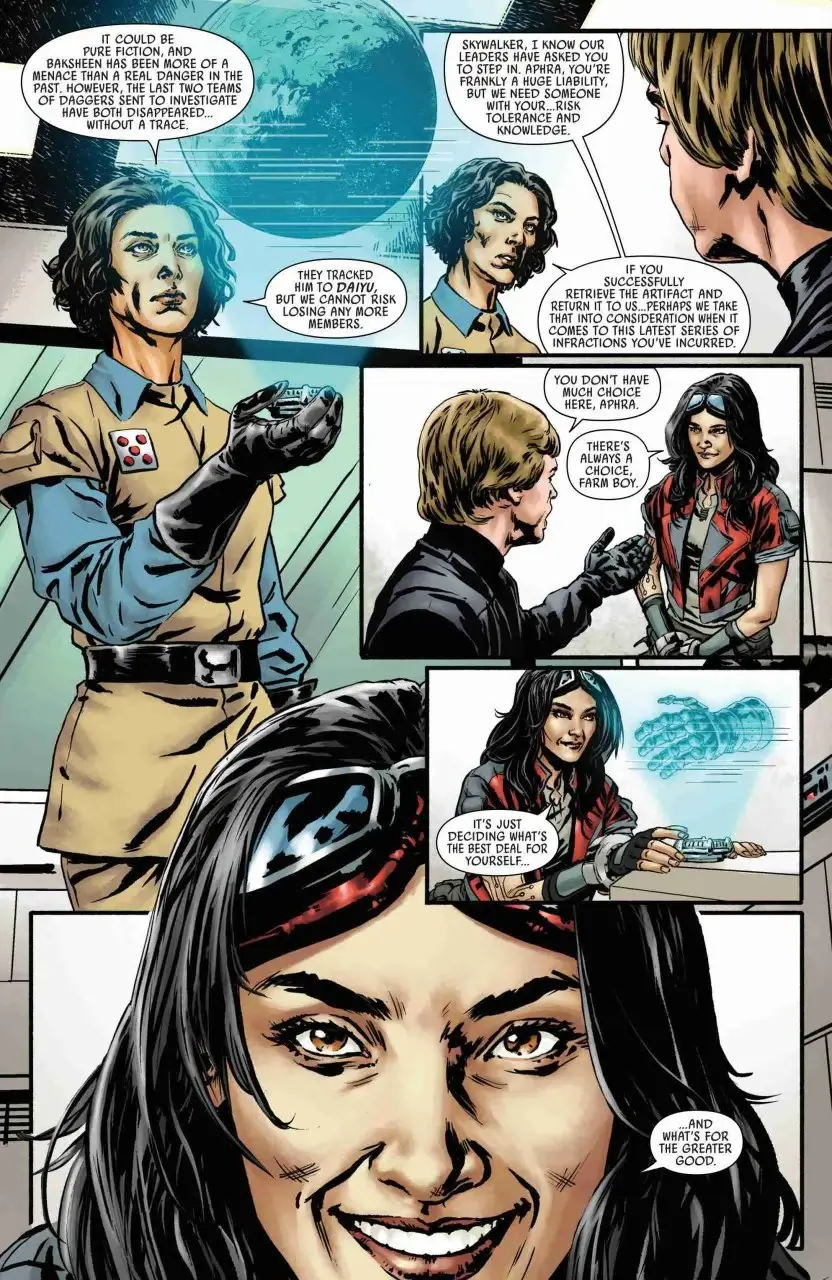 La richiesta specifica da parte di Luke nel richiedere l’ausilio di Aphra, non solo è solo determinata dal fatto che si tratti di un recupero di un artefatto archeologico, ma in particolar modo perché tale potente oggetto è in mano a ricettatori del mercato nero; luoghi e persone in cui lei è avvezza a lavorare.