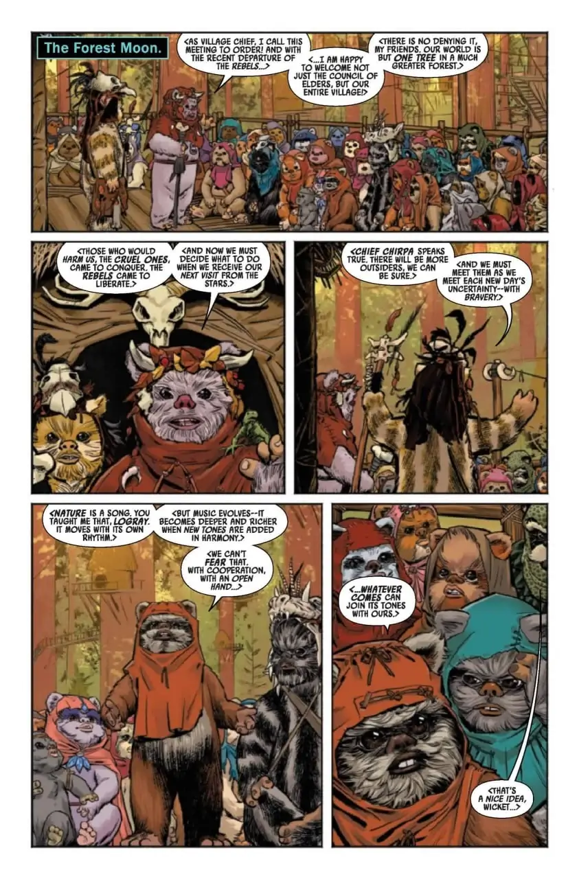 Scritta da Steve Orlando (inaspettatamente non da Cavan Scott, grandissimo fan del soggetto) e illustrata da Laura Braga e Álvaro López, la vicenda ha luogo sulla luna boscosa di Endor nel periodo immediatamente successivo dalla distruzione della seconda Morte Nera. Qui, gli Ewok del Villaggio dell’ Albero Lucente si trovano ad affrontare l’oppressione di cacciatori di taglie e Imperiali disposti a tutto pur di tornare in possesso di un intero deposito di armi e mezzi da combattimento.