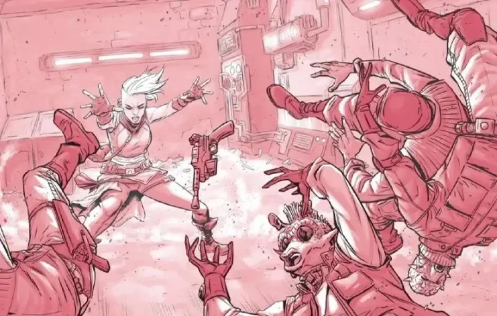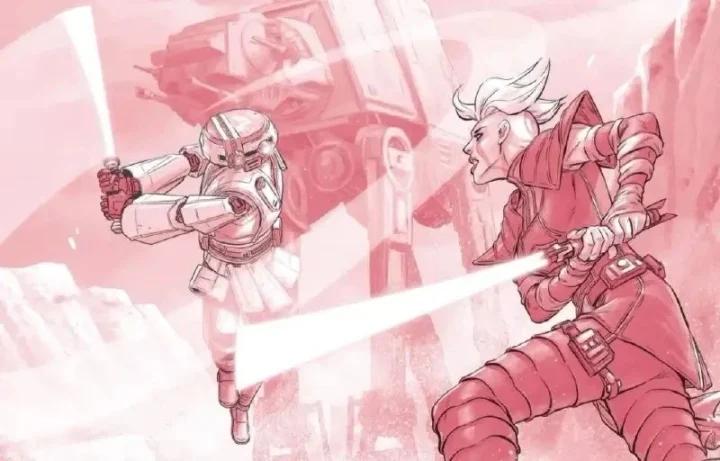 Un altro elemento molto gradito di Battle for the Arena è indubbiamente l’approfondimento di tanti altri Hunters e l’opportunità di vederli veramente interagire. Tra le dinamiche più interessanti della lettura risulta infatti la tenera rivalità tra Rieve e J3DI, il droide programmato per essere convinto di essere un membro dell’Ordine Jedi e grande conoscitore della Forza.