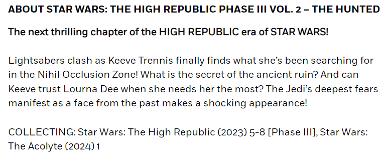 Infatti, trai dettagli della seconda raccolta Marvel de L’Alta Repubblica troviamo, sia la sinossi della raccolta, che gli albi raccolti nel volume. Qui spiccano, oltre ai logici The High Republic (2023) #5/8, anche un albo mai citato in precedenza: The Acolyte (2024) #1!