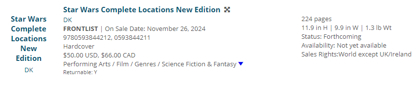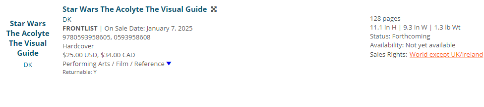 Decisamente più interessante è, poi, la notizia della pubblicazione del Visual Guide di The Acolyte: La Seguace (guida QUI), la nuova Serie Tv, in uscita dal 5 Giugno 2024, ambientata nel periodo dell’Alta Repubblica. Questa nuova guida verrà pubblicata oltreoceano il 7 Gennaio 2025, conterà 128 pagine, al costo di 25 $.
