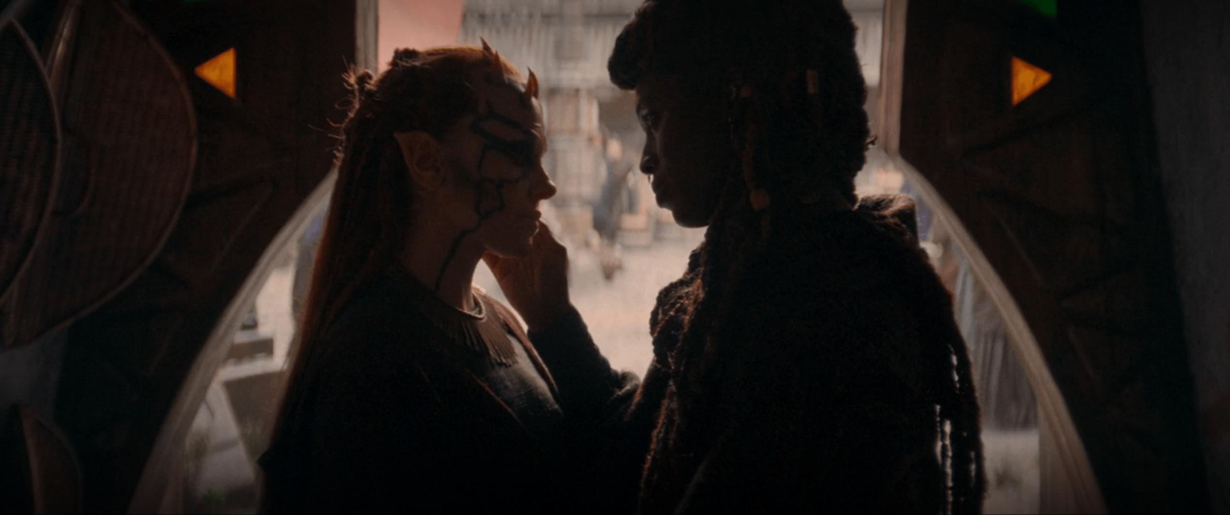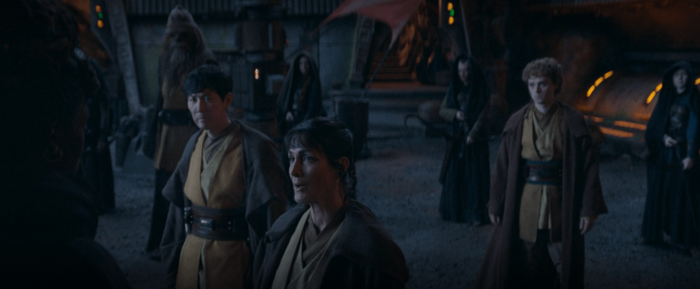 Ci viene quindi mostrato l’enorme edificio che ospita la Congrega, nel cielo vediamo inoltre le due lune di Brendok. Sebbene non siano noti i nomi dei due corpi celesti, è plausibile che si tratti di una citazione alle lune gemelle di Tython: Ashla e Bogan. Una volta entrate nel complesso, alle due vengono offerte delle creme alla Spezia, si tratta di dolci già esistenti e creati inizialmente per la guida culinaria del Galaxy’s Edge. Sebbene Koril non appaia favorevole a viziare le bambine in questo modo, è proprio Madre Aniseya, l’altra madre, nonché guida delle Streghe a permettere loro di consumare i dolci.