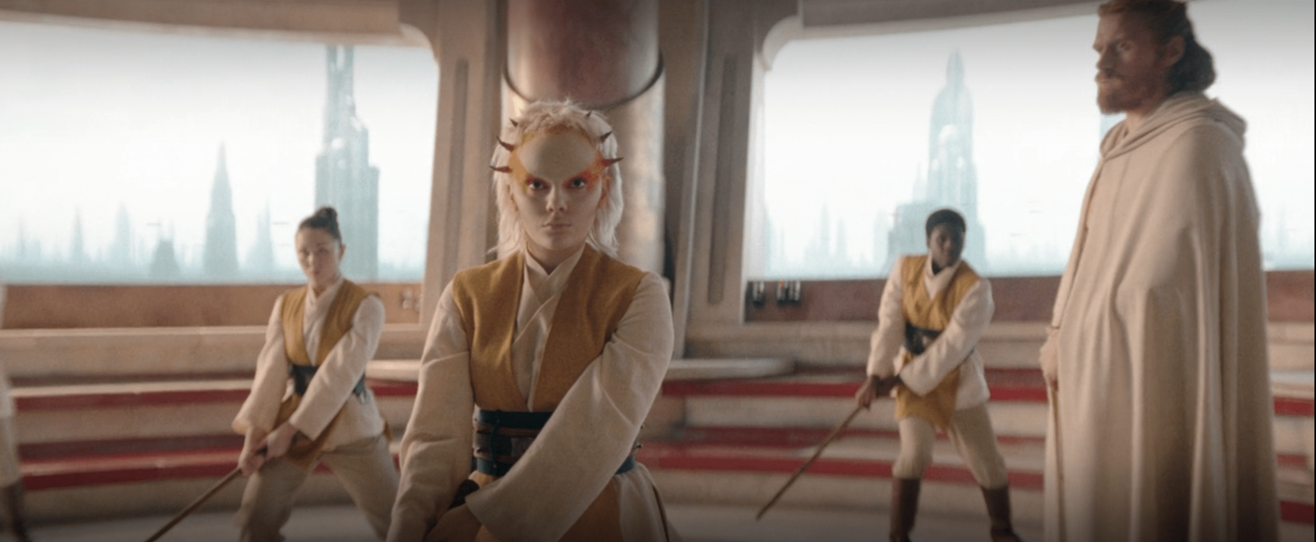 La scena si sposta ora su Coruscant, nelle sale del Tempio Jedi il Maestro Jedi Lakshay (Paul bullion) sta sovrintendendo l’addestramento di alcuni Padawan, trai quali Jecki. Mentre i Padawan ripetono le forme di combattimento, Osha li osserva, sicuramente presa dai molti ricordi del Tempio. Apparentemente l’ibrida Umana-theelin è la migliore trai Padawan, non è dato però sapere se sia un effetto voluto dal coreografo o se sia dovuto alla migliore interpetazione di Dafne Keen. Due dei Padawan, però, Daro e Rena, vengono richiamati da Lakshay per ripetere nuovamente l’esercizio.