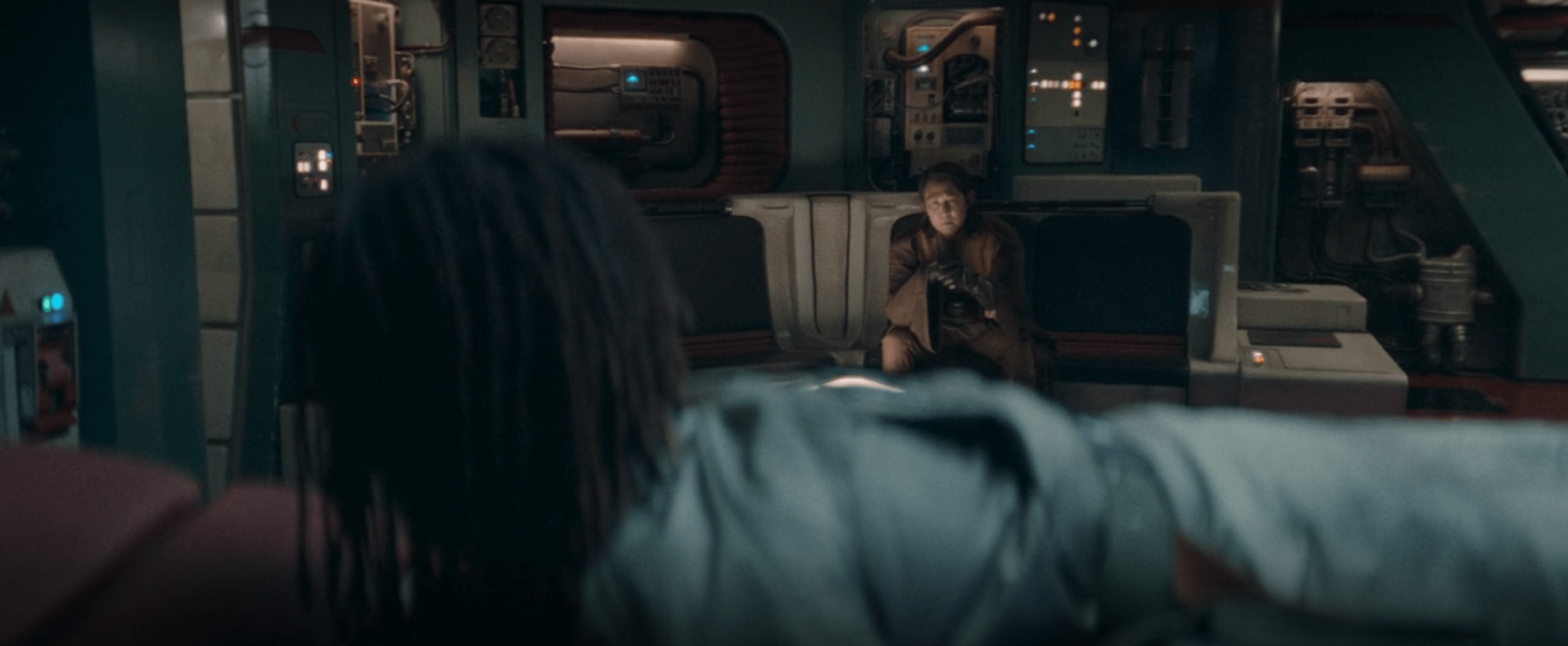L’episodio si sta per concludere: Sol ha legato Mae al lettino dello Shuttle, in modo da poterle parlare senza difficoltà. Osha, invece, invitata da Qimir, indossa l’elmo del Sith, con un’evidente citazione a Darth Vader e Kylo Ren. Importante notare come il tema musicale del Maestro dei Cavalieri di Ren sia presente sia nello scorso che in questo episodio. Che stia cominciando, quindi, ad avvenire un passaggio al Lato Oscuro dell’ex-Jedi?