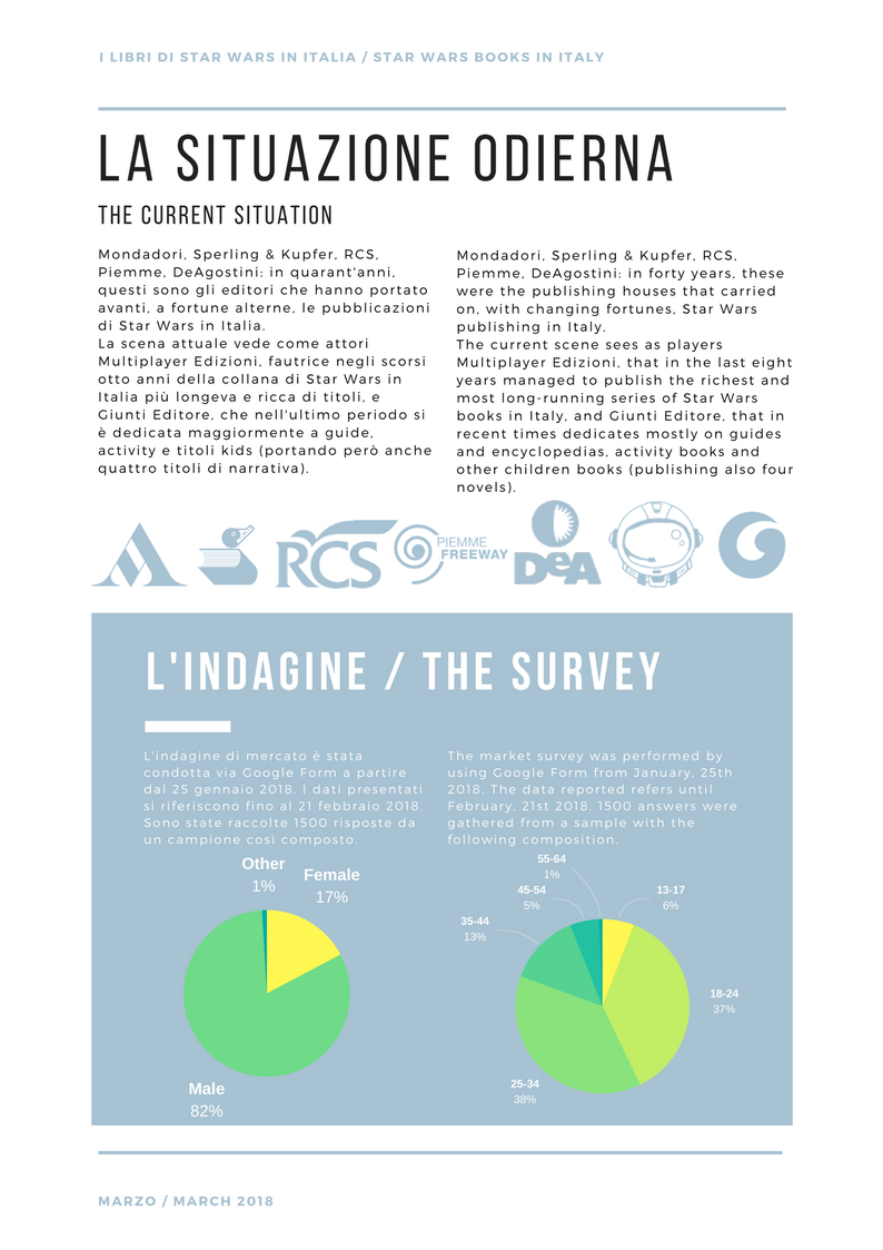A fine gennaio abbiamo lanciato una indagine di mercato per raccogliere gli interessi dei fan di Star Wars italiani sui libri di Star Wars. Noi di Star Wars Libri & Comics ci siamo impegnati a raccogliere quindi 1500 risposte, tramite un Google Form, per produrre un report pubblico e il più possibile attendibile sui gusti del fandom, sperando che un’analisi del genere possa essere utile a case editrici e al Licensing per dirimere la questione, tutt’ora bloccata, dei romanzi di Star Wars in Italia.